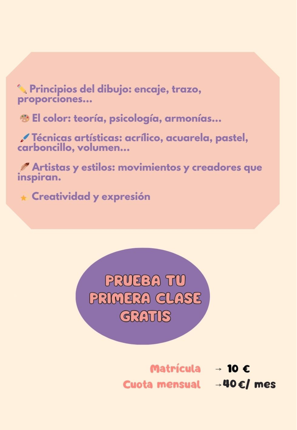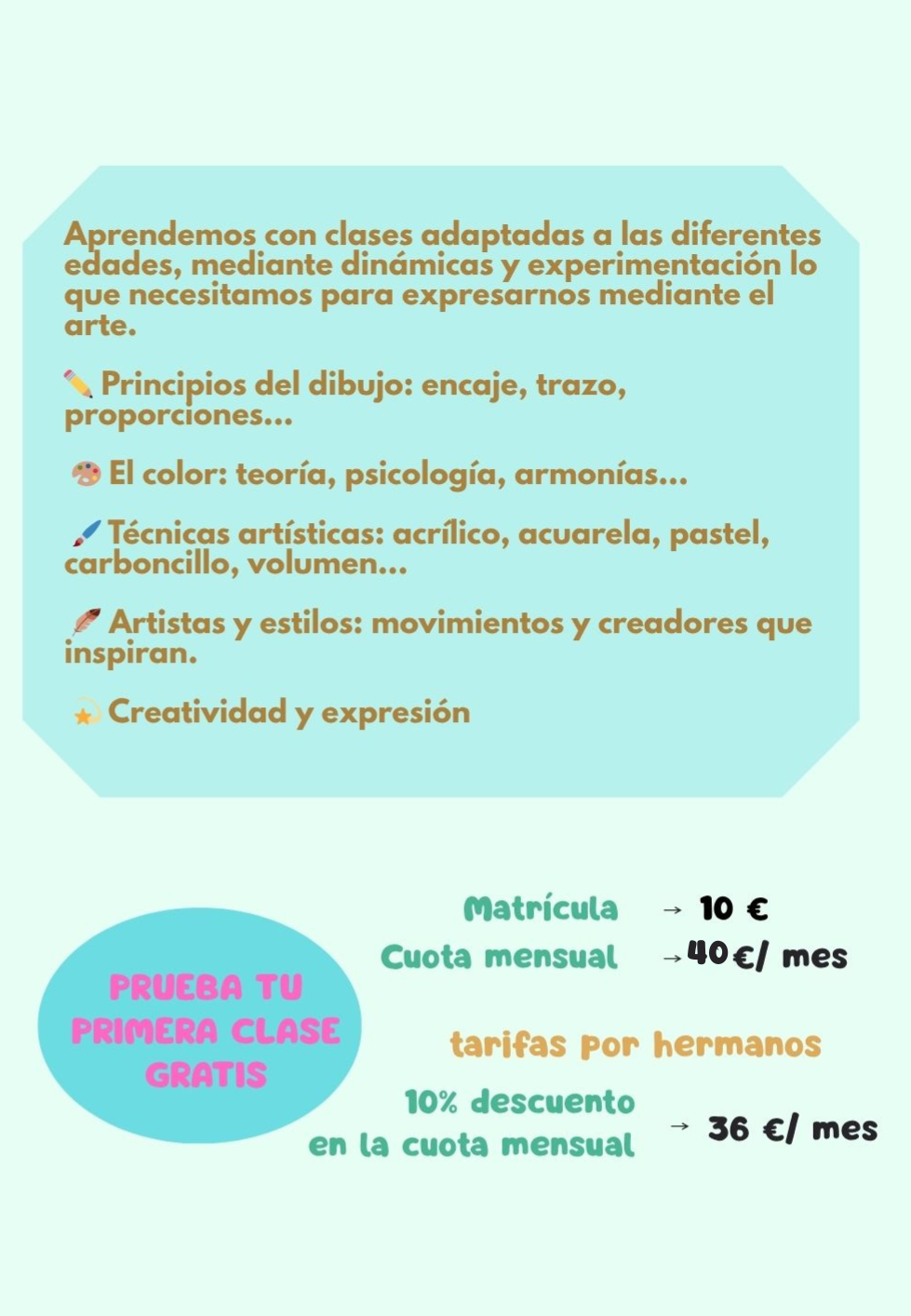 Un espacio para desconectar y dejarse llevar por el arte. Aprenderás distintas técnicas y estilos mientras disfrutas del proceso creativo y encuentras tu propio lenguaje artístico.
